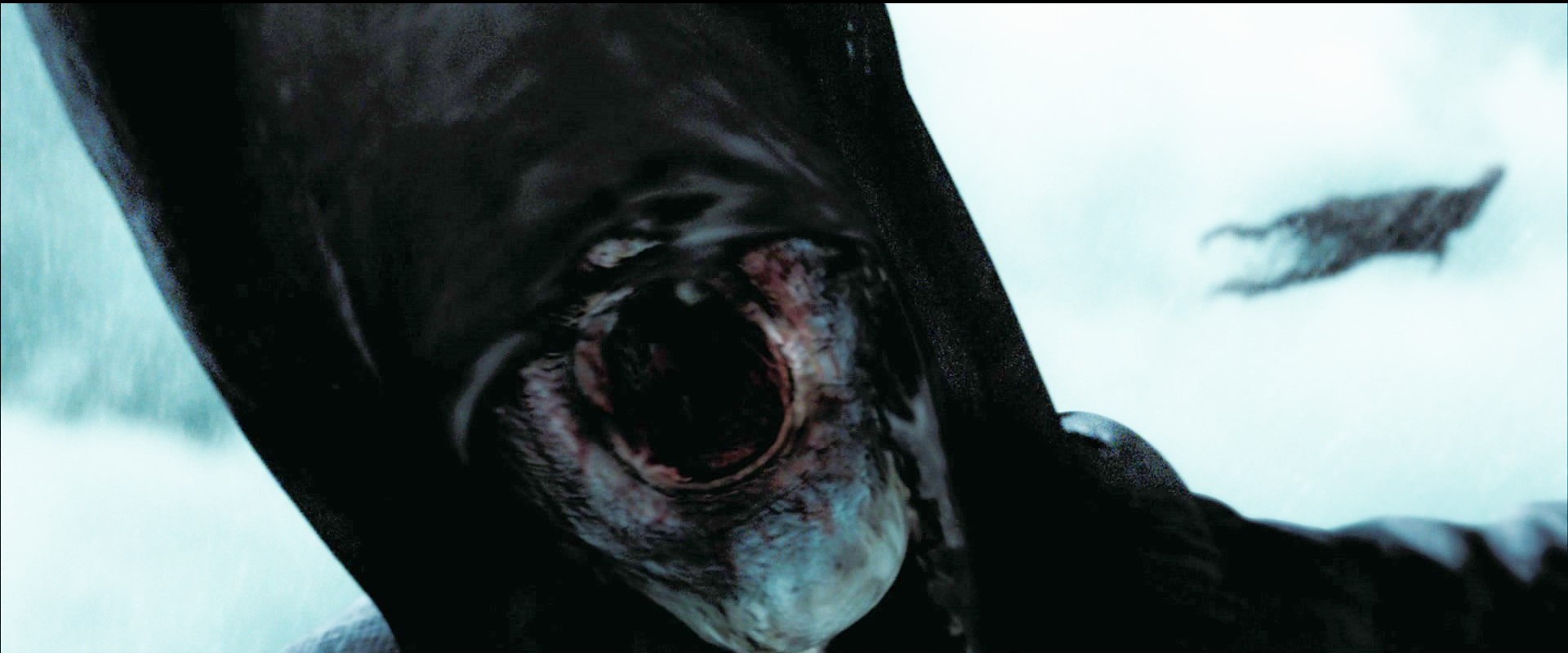 - "The air around them had frozen: Harry's breath caught and solidified in his chest. Shapes moved out in the darkness, swirling figures of concentrated blackness, moving in a great wave towards the castles, their faces hooded and their breath rattling...."