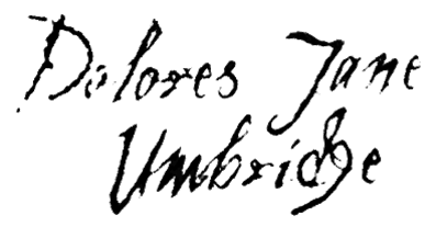 Throughout her career, Dolores attempted to garner affections of one of her superiors in order to advance her status and security, with no particular desire on which superior it would be, as long as they made a powerful husband. However, while they valued her hard work and ambition, those who got to know her best found it very difficult to like her very much. Indeed, when she got intoxicated from a glass of sweet sherry, Dolores was prone to spout very uncharitable views, which shocked even those of anti-Muggle ideologies with some of her suggestions, behind closed doors, of the treatment that the non-magical community deserved. As such, Dolores never succeeded in getting married.[1]