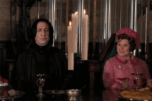 A pink and smiling Umbridge in the Great Hall next to Snape