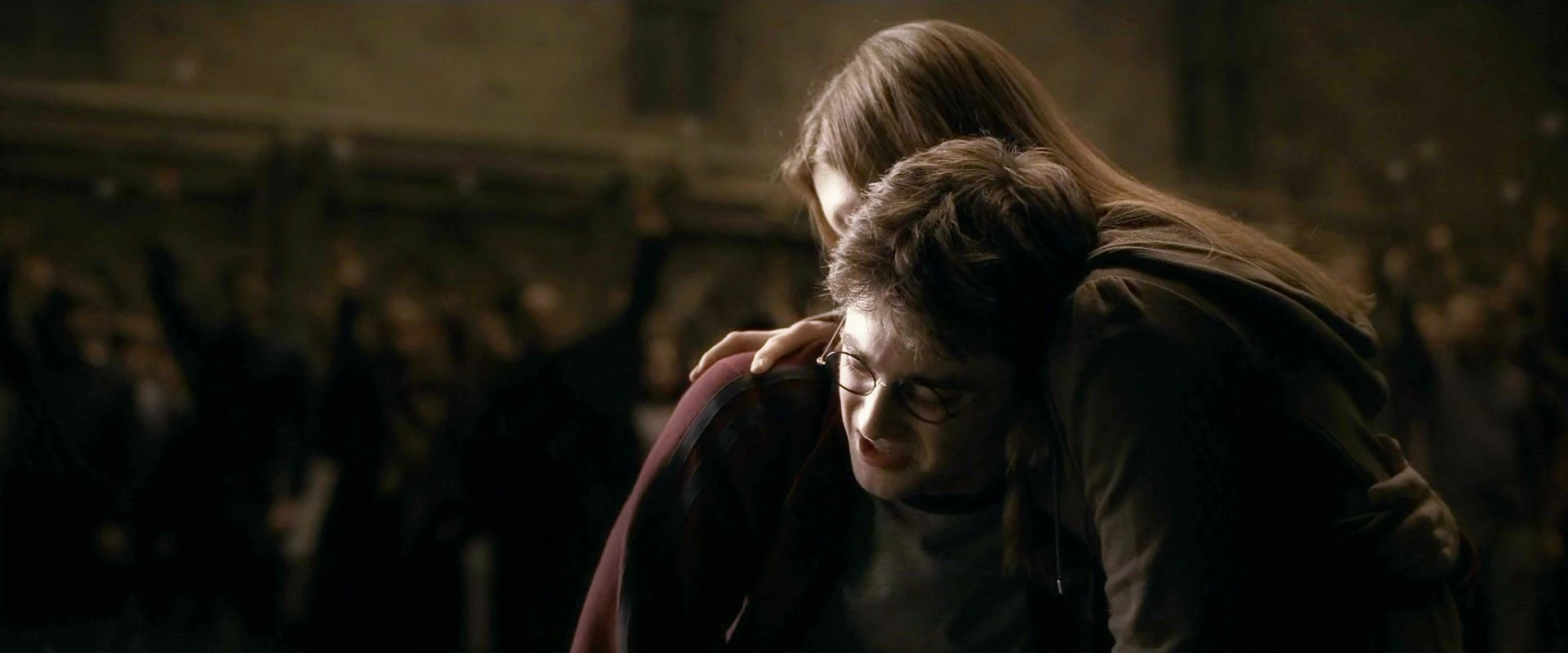 - In Year 7: Part 2, she arrives at the room of Requirement to see Harry they run towards each other to kiss, but stop and just shake hands awkwardly.