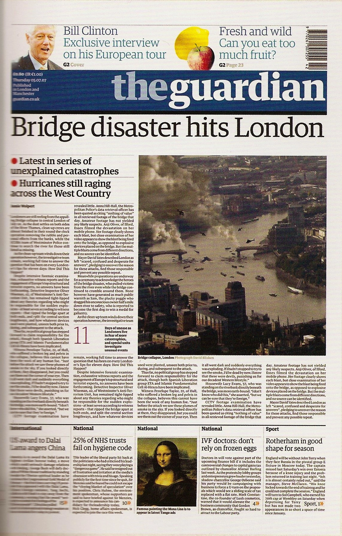 - "The police are continuing with the investigation into the cause of the Millennium Bridge disaster. River traffic has been halted as police search for survivors. The surrounding area remains closed. The Mayor has urged Londoners to remain calm..."