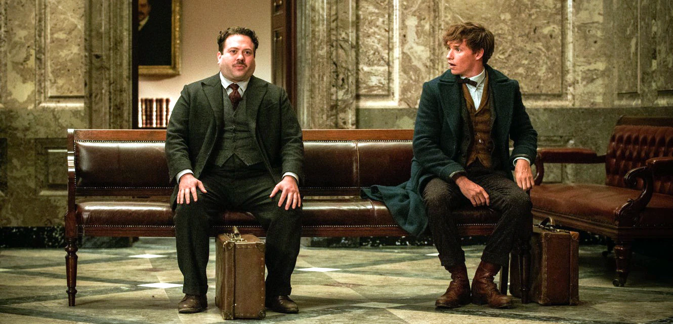 Newt with his case full of magical creatures meets No-Maj Jacob Kowalski