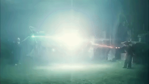 - "A jet of green light issued from Voldemorts wand just as a jet of red light blasted from Harry's — they met in midair — and suddenly Harry's wand was vibrating as though an electric charge were surging through it; his hand seized up around it; he couldn't have released it if he'd wanted to — and a narrow beam of light connected the two wands, neither red nor green, but bright, deep gold... he felt his feet lift from the ground. He and Voldemort were both being raised into the air, their wands still connected by that thread of shimmering golden light."